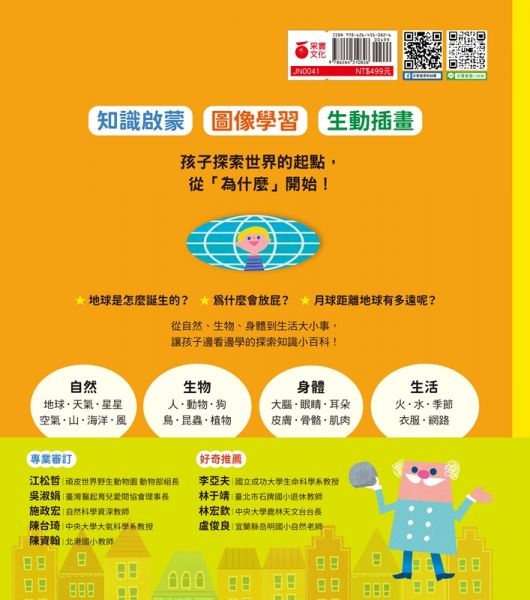 孩子的每個「為什麼」都是探索世界的起點。書中依「自然」、「生物」、「身體」、「生活」四大主題分類,讓看似簡單卻富含科學知識的問題,得到解釋。此書正是為充滿好奇心的小小探險家及關心孩子的家長所設計的一本知識科普書。──林于靖/臺北市石牌國小退休教師