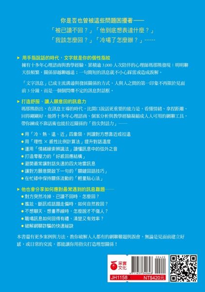 「文字溝通技巧,不僅現今必要,更是未來顯學。透過文字,如何洞悉別人?如何理解自己?瑪那熊在這本書