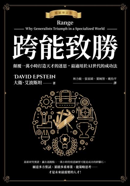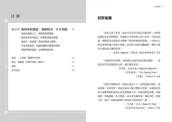 「我們已經相信單一成功之道太久了,認為要盡早起步,追求專精,著重效率。然而在這本石破天驚的大作裡,艾波斯坦指出大多數領域的成功之道其實截然不同,反而是廣泛涉獵,四處經歷,多繞遠路,多方嘗試。這本書至關重要,無比切時,無論主管、家長、教練或想提升表現的人都該好好一讀。」──丹尼爾.品克(Daniel H. Pink),《動機,單純的力量》(Drive)、《什麼時候是好時候》(When)作者