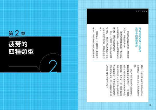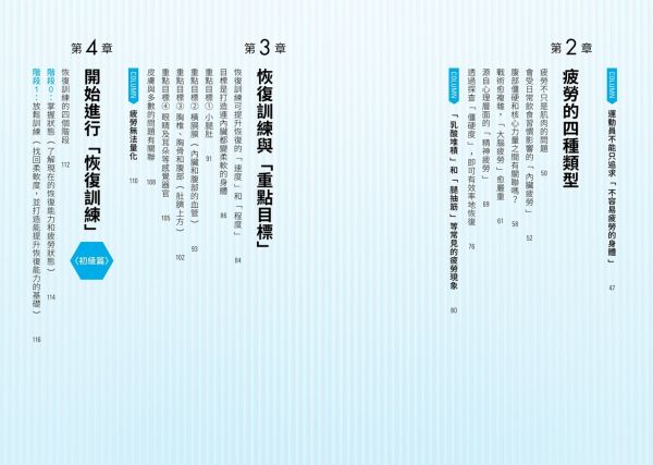 先檢視自己的疲勞狀態、確認僵硬部位,再透過呼吸和動作調整,一步步建立個人的疲勞恢復系統。不但有具體方法,還有練習的心法,強化實踐效果。這套訓練系統不僅幫助一般人解除疲勞,更提升了許多職業運動員的運動表現!