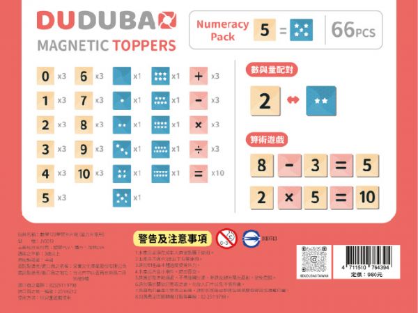 1.           雙面印刷磁貼,數字0~10、數量點數0~10,搭配加減運算符號,共66片