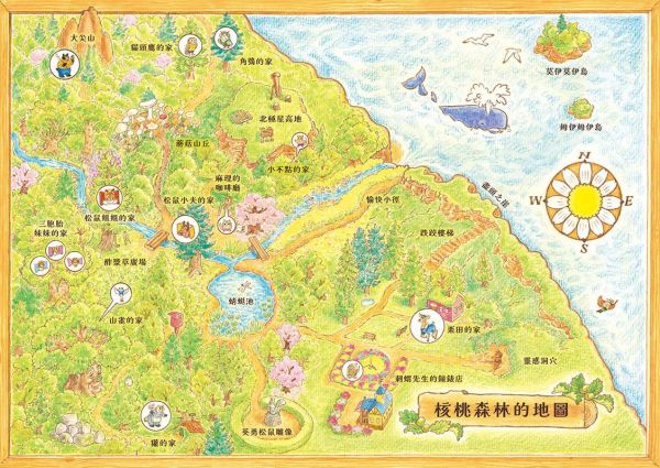 ★故事一開始,跨頁全彩的「核桃森林地圖」,增添故事的趣味性和延伸性。仔細看看圖中有什麼?森林裡充滿了美麗的自然風光,包括動物的家、蜻蜓池、蘑菇山丘和大尖山等。從發現特定景物的過程中,訓練孩子的觀察力與視覺搜尋能力。