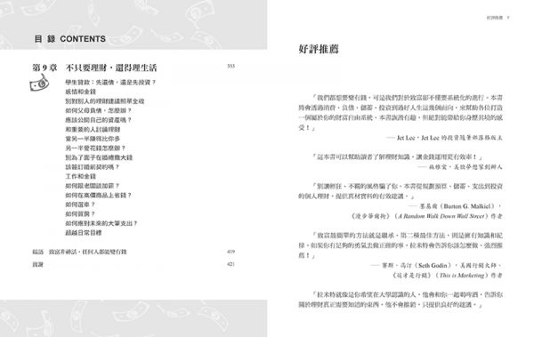 「別讓輕狂、不羈的風格騙了你。本書從規劃預算、儲蓄、支出到投資的個人理財決策,提供真材實料的有效建議。」──墨基爾(Burton G. Malkiel),《漫步華爾街》(A Random Walk Down Wall Street)作者