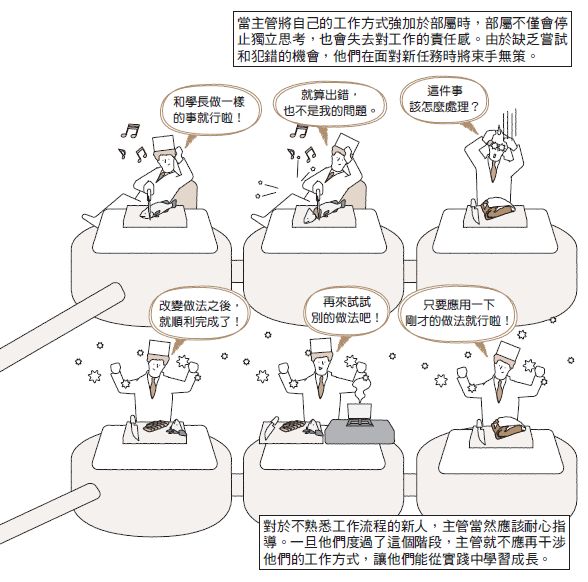 對於不熟悉工作流程的新人,主管當然應該提供詳細的指導。一旦他們度過了這個階段,就應該放手讓他們自行決定工作方式。過去表現優秀的主管往往對自己的做事方法充滿自信,因此容易忍不住插手干涉。雖然這樣做可能讓部屬順利達成任務,卻會讓他們失去獨立思考的能力。一旦遇到失敗,他們也可能將責任歸咎於他人,缺乏責任感。