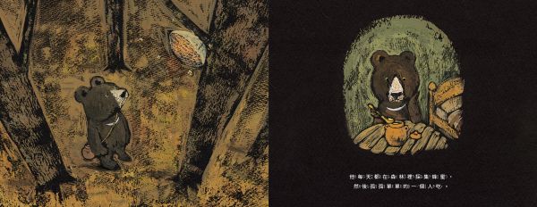 此繪本由昏暗的森林場景拉開序幕,深沉濃郁的色彩,讓人感受到熊先生的孤寂與沉悶。但隨著故事的發展,不僅景色逐漸明亮,熊先生的嘴角也逐漸上揚。