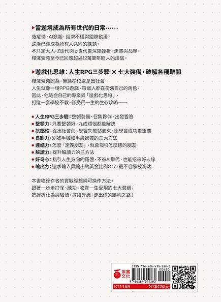 「人生如同一場遊戲,許多的關卡等著你。該如何破解?要如何晉級?面對挫折如何不傷元氣?透過遊戲化的思維,練就七大生存裝備,隨時調整心態應對,就讓這本書來告訴你。」