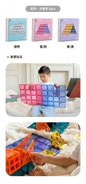 大幫手(透明2片)以單色4*4大正方形,成為孩子搭建磁力片的最佳幫手。透過大面積支撐,穩固其他各式形狀的磁力片,讓作品不會輕易倒塌。