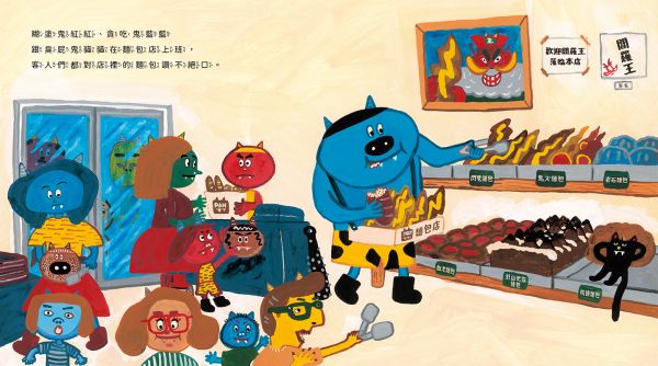 糊塗鬼紅紅、貪吃鬼藍藍和臭屁鬼貓貓在妖怪麵包店上班。