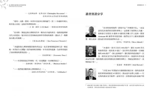「別讓輕狂、不羈的風格騙了你。本書從規劃預算、儲蓄、支出到投資的個人理財決策,提供真材實料的有效建議。」──墨基爾(Burton G. Malkiel),《漫步華爾街》(A Random Walk Down Wall Street)作者