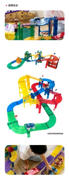 引導式的教案手冊以階段性區分,從認識不同類型的軌道開始,先練習拼出一般線性道路,再到環形道路,進而延伸到八字形迴圈道路。完成基礎模式的練習後,試著加入支架,一階、兩階往上疊加,利用坡度軌道,將路線變得更加有層次且富有變化性。