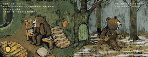 此繪本由昏暗的森林場景拉開序幕,深沉濃郁的色彩,讓人感受到熊先生的孤寂與沉悶。但隨著故事的發展,不僅景色逐漸明亮,熊先生的嘴角也逐漸上揚。