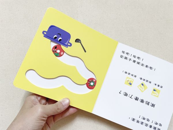 動動小手之後,開始動動小眼睛,看看書中的每個畫面,無論是顏色或是線條,由抽象到具體,由簡單到複雜,都是貼近寶寶的生活經驗,讓孩子逐一發現書中每個圖畫的細節是有趣的體驗。