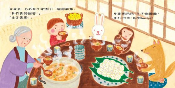 故事中小動物們在冬至這天泡著暖呼呼的柚子溫泉,吃著讓身體更健康的蔬菜料理,可愛的故事在寒冷的冬天展開,讓人感受到溫暖。