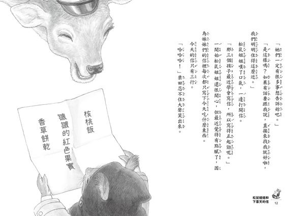 每一頁都有著精美細膩又精采絕倫的插圖,將核桃森林的自然風光、人物角色蓬鬆的毛髮、看起來美味的茶和甜點,以及松鼠姐姐房間的景像都描繪得惟妙惟肖。松鼠姐姐的住所──落葉松樹洞裡的家,也充滿著迷人魅力。與孩子一同閱讀,享受美好的圖像語言。