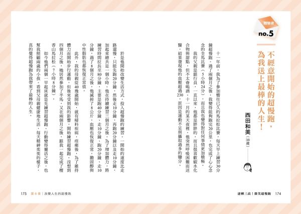 「超慢跑雖然在台灣愈來愈受歡迎,但若缺乏正確知識,也可能造成運動傷害。這本書用淺白口吻與清楚圖文,幫助讀者認識超慢跑,讀起來輕鬆,也讓人想立刻開始。你可以先從各章標題與圖片建立概念,再從一天5分鐘練起,慢慢遠離坐式生活。每個人的身體狀況不同,但只要專心感受回饋、遇到問題回書中找答案,再搭配書末的正確收操,就更有機會透過超慢跑找回健康、輕盈的自己。」──馬拉松治療師 林世奇