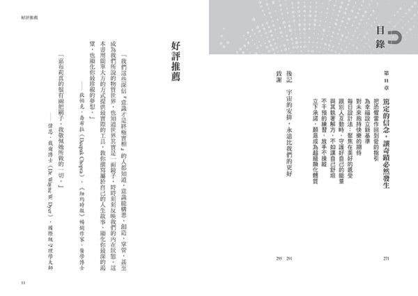 「我們這些深信『意識才是終極實相』的人都知道,意識能構思、創造、掌管,甚至成為我們所說的物質世界,也知道世界其實是一面鏡子,時時刻刻反映我們的內在狀態。這本書用簡單大方的方式提供最實際的工具,教你撰寫屬於自己的人生故事,顯化你最深的渴望,也顯化你最珍視的夢想。」——狄帕克.喬布拉(Deepak Chopra),《紐約時報》暢銷作家、醫學博士